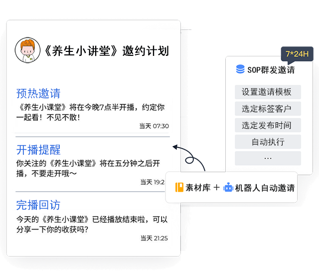 基于RPA模拟人工群发,仅需要提前编辑好模板,在节目开播的前/中/后分别自动发送预热邀请、开播提醒、完播回访等文案和观看链接给客户,实现全生命周期的邀请自动化,同一客户可以每天批量推送多次