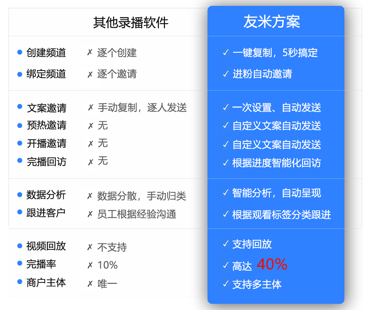 市面上唯一打通企业微信的录播方案,对新客发送邀请链接绑定节目,绑定状态实时呈现,未绑定客户直接一键唤起聊天界面,省去来回查找的时间,绑定效率更高!